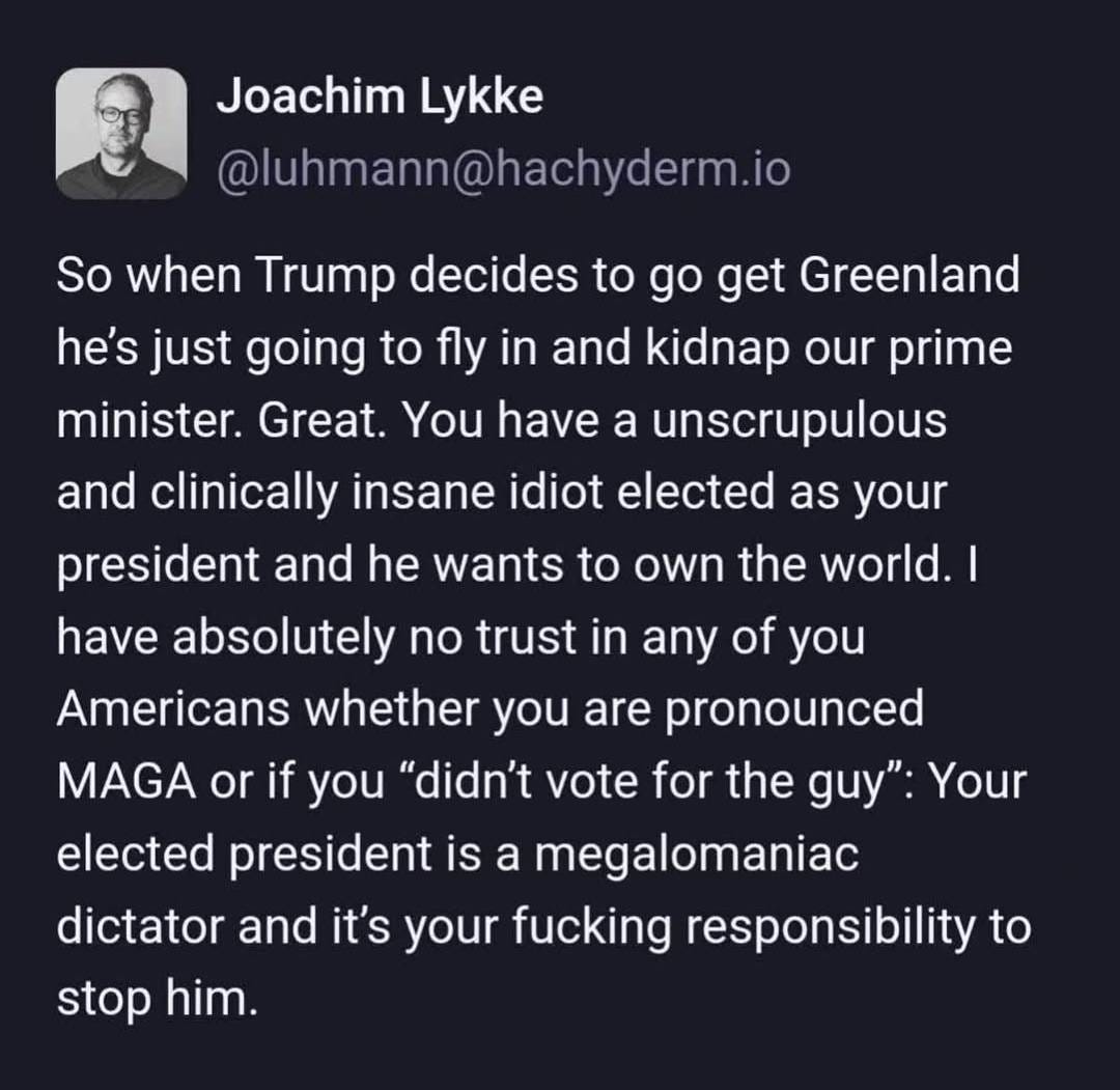 The image above is going around social media. Maybe you have seen it. A critique of the people of the United States from a Greenlander. A lot of people on the left are beating their chests over it. It is demoralizing and the opposite of what we need right now.